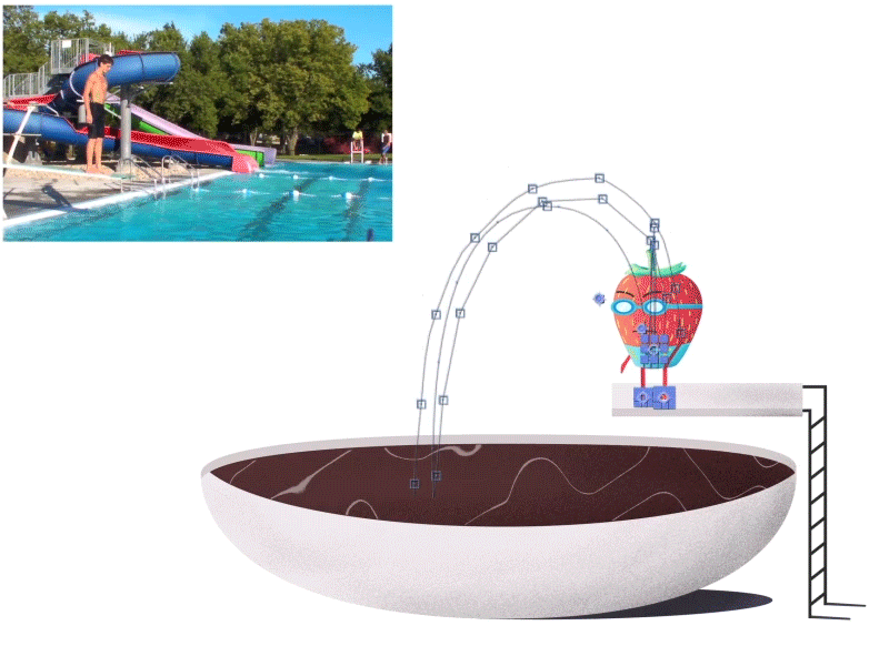 Una vez que el rig de los personajes y elementos han sido realizados, reuni video referencias de personas que practicaban clavados en piscina, para observar a detalle el movimiento del cuerpo, poses claves, arcos y líneas de acción para adaptarlas al personaje.