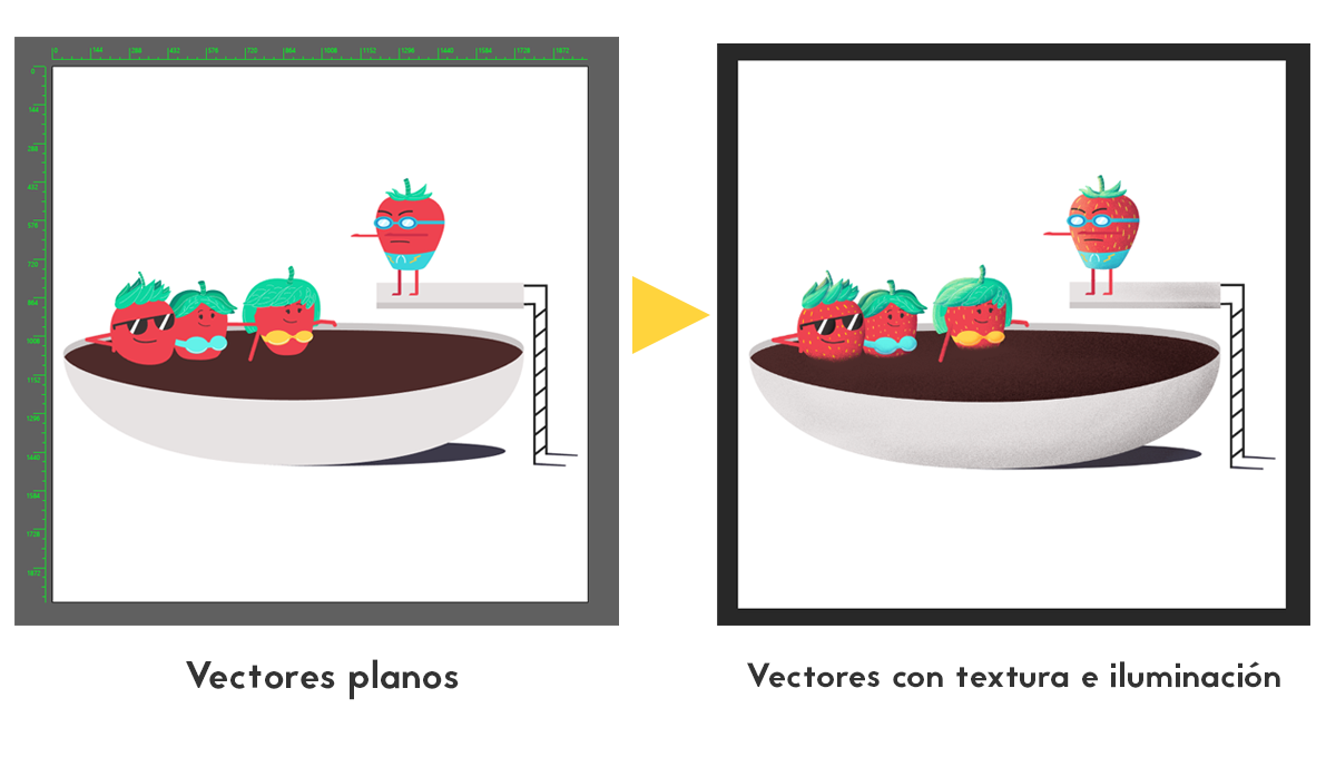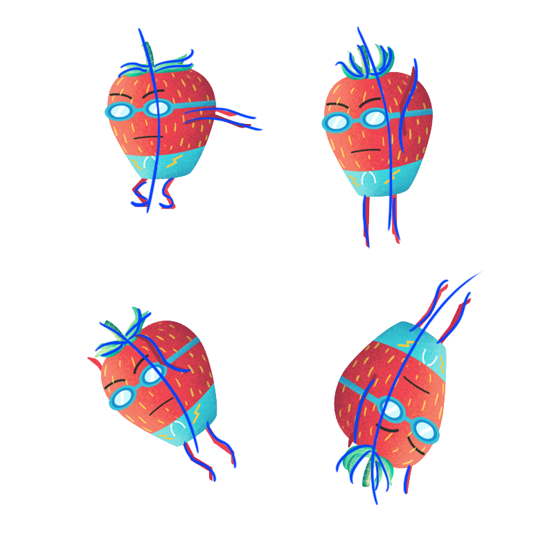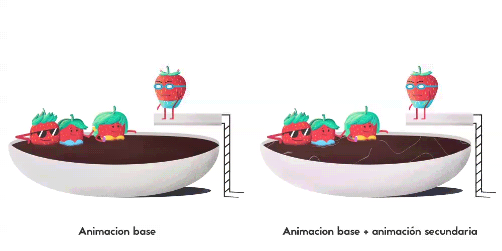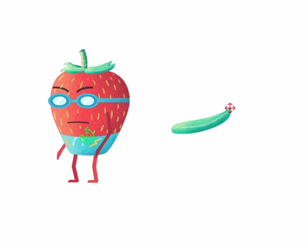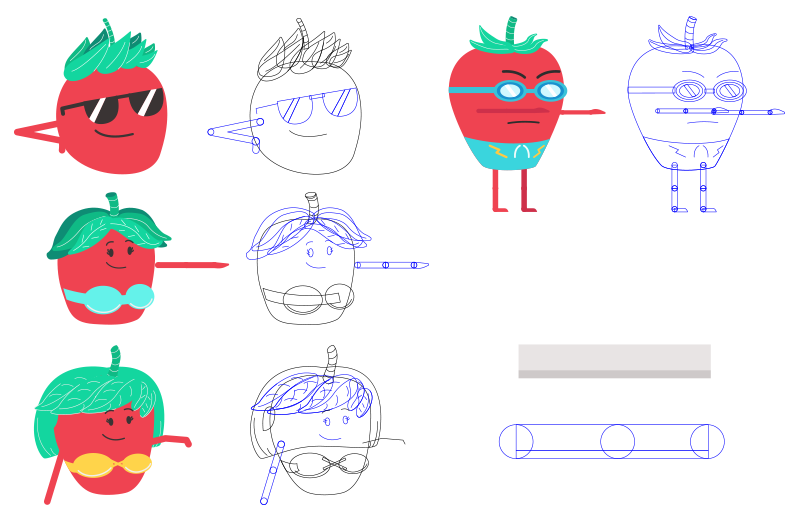 Una vez terminado el texturizado, importé el documento a After Effects para comenzar a animar, no sin antes realizar el rigging de los personajes. En este caso, solamente uno de los personajes tiene una acción compleja, por lo que es el único que necesita un rig de cuerpo completo, en el caso de las demás fresas, únicamente están separadas las partes necesarias para realizar sus respectivas acciones, las cuales fueron planeadas antes de realizar la ilustración y así optimizar sus estructuras.