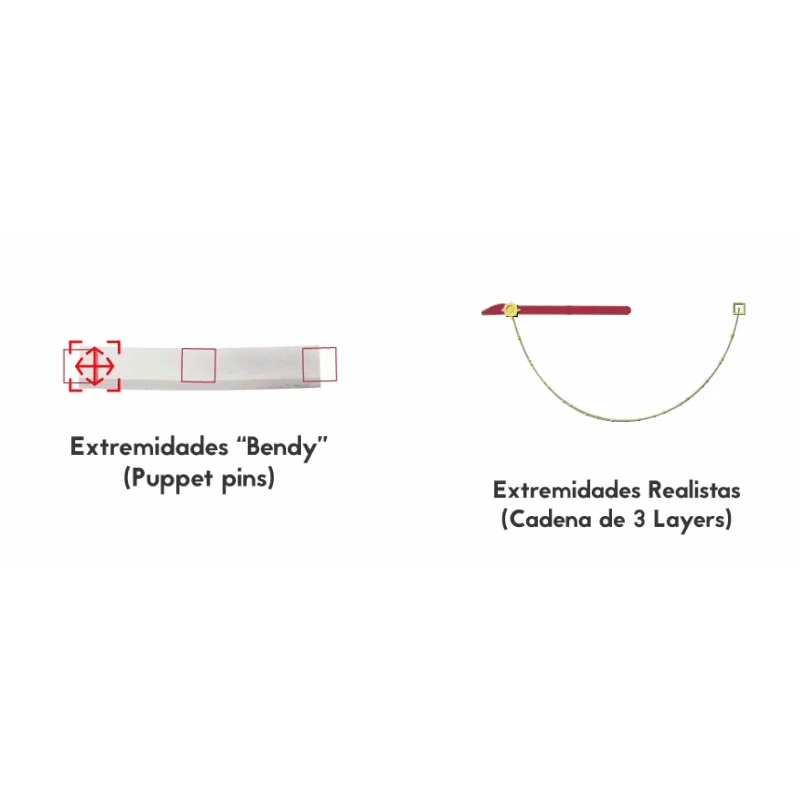 Para tener un control total de los movimientos, se crearon los respectivos puntos de articulación, de este modo podemos realizar rigs basados en layers para las extremidades y rigs basados en deformaciones con puppet pins para elementos que necesiten un movimiento más orgánico, como por ejemplo la tabla de salto.