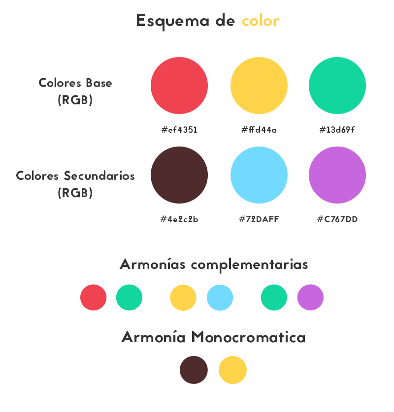 El esquema de color esta basado en la armonía complementaria rojo - verde, los colores secundarios -amarillo /azul /café - giran también en torno a esta armonía.