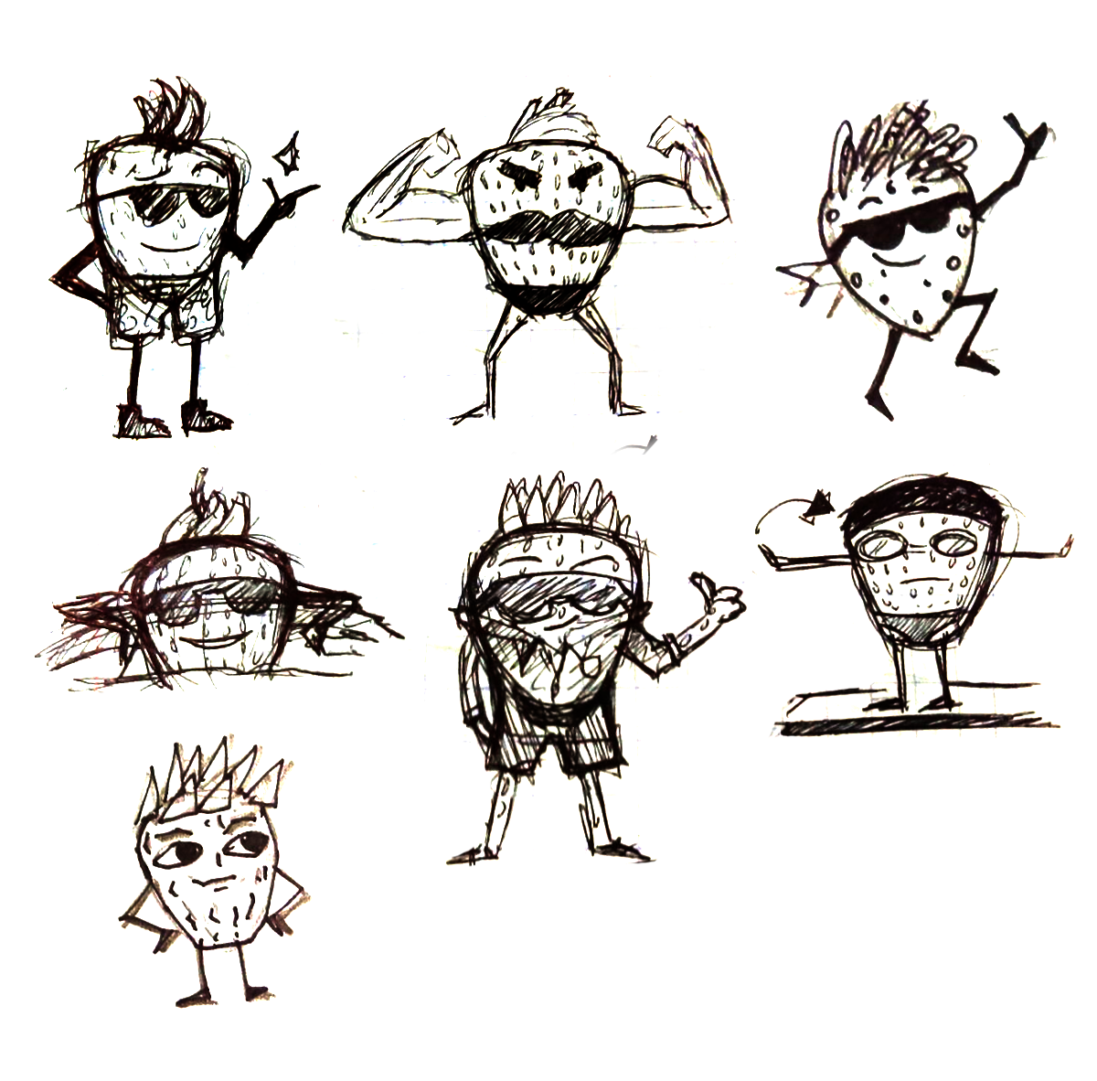 Una vez explorado a detalle el concepto de diseño, comencé a elaborar bocetos burdos de los personajes, explorando principalmente la forma y la personalidad de estos.