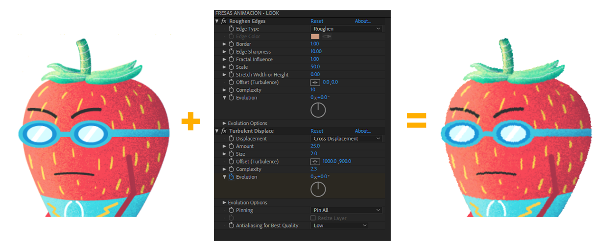 Ya que la animación estaba terminada en su totalidad, agregue un layer de ajuste con el efecto “Roughen Edges” el cual me permitió darle el acabado final con bordes desgastados.