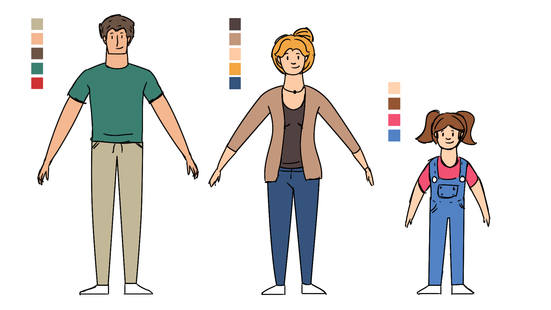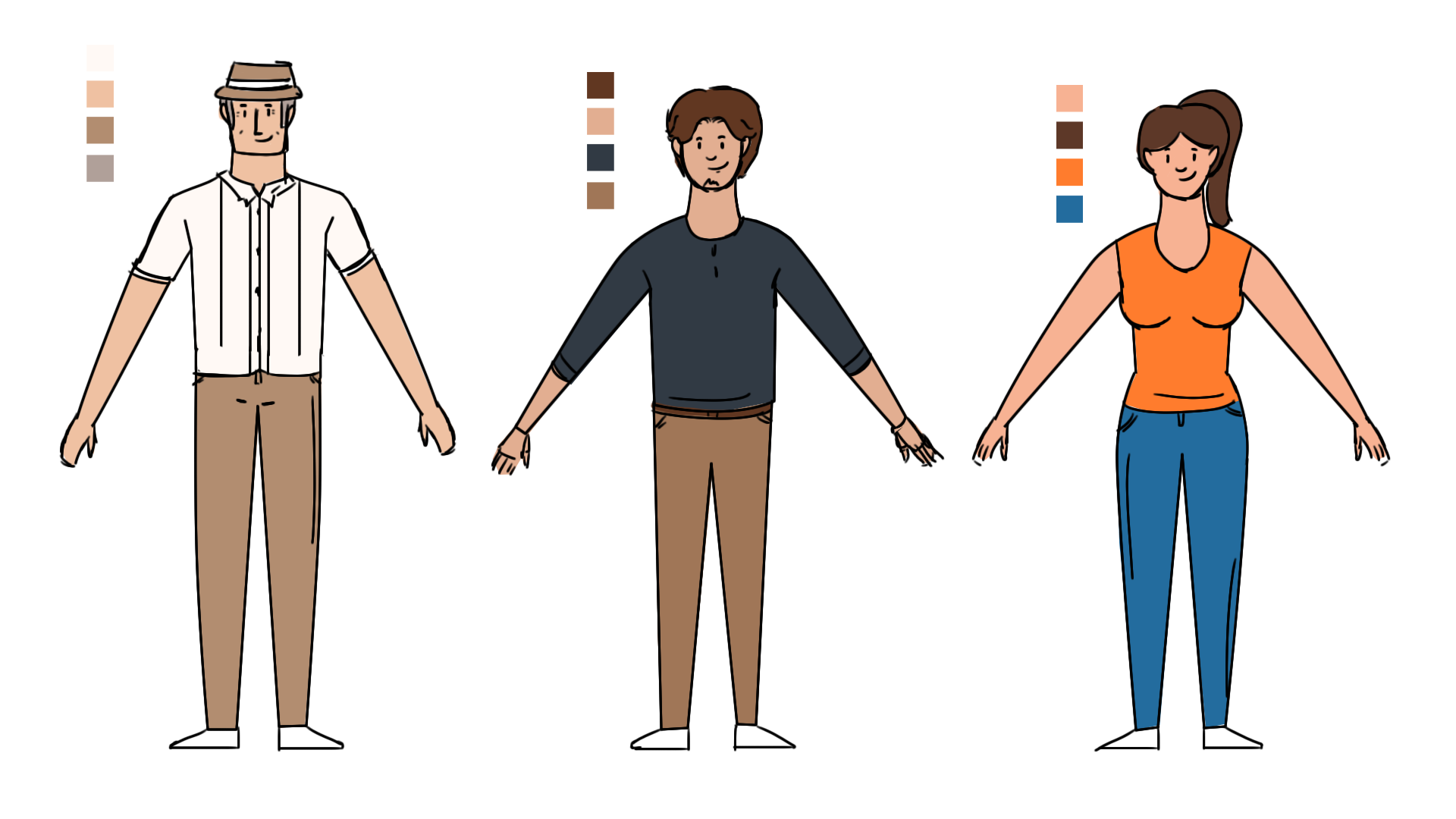 Una vez aprobados los bocetos y el storyboard, realice la ilustración vectorial de personajes con sus respectivas estructuras para rigging y los escenarios.