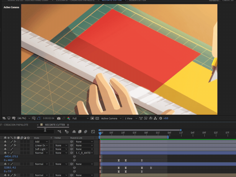 El uso del espacio 3D en After Effects fue fundamental para que los movimientos de cámara y efectos como la profundidad de campo en algunos shots fueran precisos.